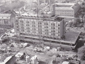 És akkor kanyarodjunk vissza egy kicsit a forrásokhoz meg a tervekhez! Arról már többször volt szó, hogy a Móra Ferenc úti lakótelep ellátásához szükséges ABC-t a Szolnok környéki TSZ-ek építették, ez lett aztán a Szövetség. A Kassai úti 900-ast az Élelmiszer Kiskereskedelmi Vállalat, a Bajcsy útra 1974-ben még csak tervezett Barátság ABC-t pedig a Szolnok és Vidéke ÁFÉSZ finanszírozta. Ez utóbbit a Jubileum téri új ABC és étterem felépítésének költsége is nyomaszthatta, amit abban az évben 20 millióra taksáltak, és végül nem is valósult meg csak 1978-ra, Szolnok ABC néven. És ugyancsak később valóra vált ígéret lett a tér másik oldalán, a tízemeletesek elé ívben felépített újabb ABC és iparcikkbolt is, a Bizományi Áruház Vállalat 1974-ben még 500 négyzetméteresre és kétszintesre álmodott szolnoki egysége pedig végül jóval szerényebb kivitelű lett. Szolnok 900 éves évfordulójára készülve szeretett volna a MESZÖV az új városközpontban egy 3100 négyzetméteres áruházat felépíteni, de 1974 elején ennek még nem látszott a forrása, és később is máshogy és kicsit más helyen valósult meg, hogy aztán 1977-ben Skála Tiszavidék néven nyisson meg. Az Iparcikk Kiskereskedelmi Vállalat lobbizása viszont célt ért, és 1974-ben elindulhatott a Domus építése, ami a terveknek megfelelően 1975 decemberére meg is nyílt. (Fotó: Dombi Gábor gyűjteménye)