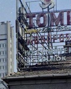 Ezen a negyvenegynéhány éves fotón persze más, apró érdekesség is észrevehető. Például a pártház mögül mintha hiányozna a konferenciaterem – ma kínai bolt – blokkja. Nem tudom eldönteni, hogy csak a látószög miatt nem látszik, avagy valóban csak később készült el. (Ha valakinek van erre vonatkozó információja, kérem, ossza meg!) Inkább kedves – emlék -, mint érdekes a kép jobb felső sarkában lévő Tomi mosópor neonreklám, ami a 4-es kereszteződése miatt, sokáig volt az átutazók számára is emblematikus szolnoki hirdetés. Miként az ugyanennek az épületnek a földszintjén működő Rádió és Televízió szaküzlet, jelenleg ruhabolt, ahol szerintem sok szolnoki vehette meg élete első tévéjét.