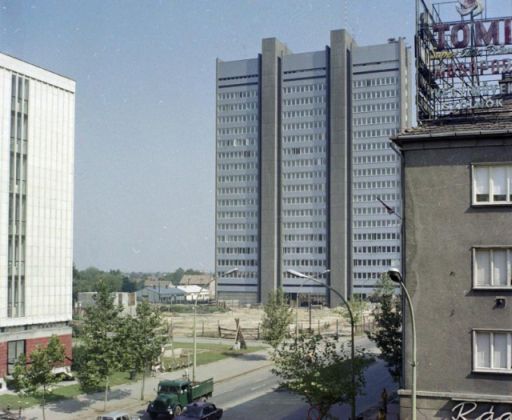 Miként érdemes észrevenni azt a trafóházat is, ami ezen a képen, a pártház sarka mögött látható. És amiről ilyen felvétel pár évvel később már nem készülhetett. Nem csupán amiatt, hogy a Nerfeld-palotát eldózerolták. Hanem, mert a kisebb-nagyobb csúszásokkal felépülő Centrum mögött 1979-re elkészült a művelődési ház – ma Aba-Novák -, illetve a két létesítményt összekötő egyemeletes irodaházak. Amelyek kvázi körbekerítették a trafóházat, ami egyébként a mai napig ott áll, igaz, immár egy belső udvar közepén.
