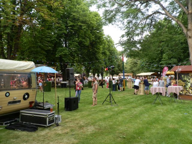 Beléptünk. És nem telt meg a szandálom az apró, sárga gyöngykaviccsal. Hanem szinte süppedt a lábam a fűben. A lakókocsi színpad előtt könyöklők, némelyik műfűvel borítva. Mellette gyerekfoglalkoztató, azon túl a végre elkészült játszótér. Tömve. A Rotary emlékkő körül pedig a Pálinkaland büféi, meg a korábban a színház mellett álló színpad, a megszokott retró székek, és a fákon mindenütt lámpák. Az egész bejáratánál pedig egy kacatokból összerakott gyerekszórakoztató tábla, amivel csak azért nem kezdtem el játszani, mert akárhányszor csak arra mentünk, mindig használta valaki.