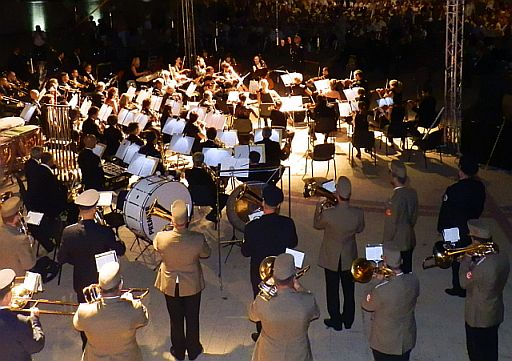 Igaz, amikor a három katona-zenekar felsorakozott a Szolnoki Szimfonikusok köré, azt már nem lehetett vizuálisan kihagyni. Vagy kétszáz ember jóvoltából szólt a zene rendesen. Beleborzongott az egész tér.