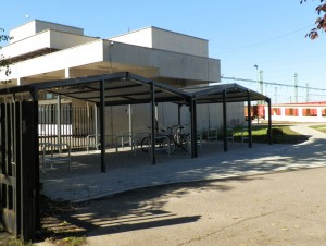 Továbbá bosszankodjunk egyrészt amiatt, hogy a kerékpártárolóépítés projektjét láthatóan a MÁV birodalom különböző részei között nem sikerült összehangolni. Így fordulhat elő az a rendkívül faramuci helyzet, hogy a tárolóhoz vezető kapu mellett egy „Illetékteleneknek belépni tilos” tábla látható. Ezen még könnyen túlléphetünk azzal, hogy a tároló használóiként talán nem vagyunk illetéktelenek. A kapu belső, sínek felőli oldalán lévő felirat viszont kifejezetten ijesztő, hiszen arra figyelmeztet, hogy „Nem kijárat. Állandóan zárva tartott kapu!”. Márpedig, ha ez így van, akkor a MÁV vagy foglyul ejtheti a leparkol bringákat, vagy azokat a kerítésen átemelve, esetleg a peronon és az utascsarnokon keresztül tudjuk csak elvinni. Persze az is lehet, hogy ez is csak egy olyan tábla a MÁV birodalomban, amit nem kell figyelembe venni.