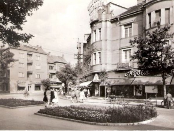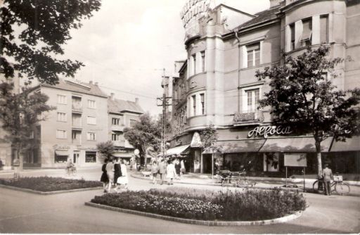 Érdemes megfigyelni a sarki, emeleti homlokzatát, ahol legalább négy alakból álló, gazdag falikép díszíthette az épületet. Ahogy a zebrával szembeni, emeleti erkély kovácsoltvas korlátjára is figyeljünk oda, ami ugyancsak az épület egykori gazdag díszítettségére utal. A ház földszintjén a hatvanas évek elején már az Alföld áruház működött, aminek kirakatait akkoriban divatos – és praktikus – napernyők védték. A ház tetején pedig ott az Állami Biztosító fényreklámja – szerintem a város első ilyen építménye -, illetve az első és második emelet, továbbá a földszinti portálok fölött is világító betűsorok láthatók.