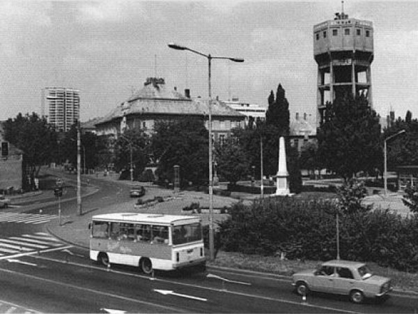 Hogy a kép a nyolcvanas évek elején készült arra az évtized második feléből derengő emlékeimből következtetek. Akkoriban ugyanis már messze nem volt ilyen rendezett a víztorony környéke. Egy bozótos, elhanyagolt, kétes kinézetű park vette körül a már harminc éve is üresen álló és pusztuló tornyot. Ezzel együtt az Eötvös tér még valóban tér és nem egy nagy kereszteződés volt. A Thököly út felől ma itt körforgalomba torkolló út – ahogy ezt a kép is mutatja – még zsákutca volt, amit a fotó jobb szélén látható épület zárt le. Erre a zsákutcára pedig szinte mindenkinek emlékezhet, aki a nyolcvanas években szerezte a jogosítványát. Két dolog miatt. Egyrészt innen indultunk a városi vezetésre, illetve rutinozni is lehetett ezen a részen, másrészt ebben a zsákutcában kellett a műszaki és az egészségügyi vizsgát is letenni.