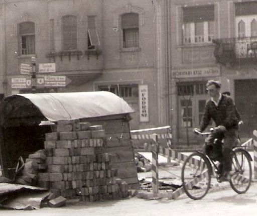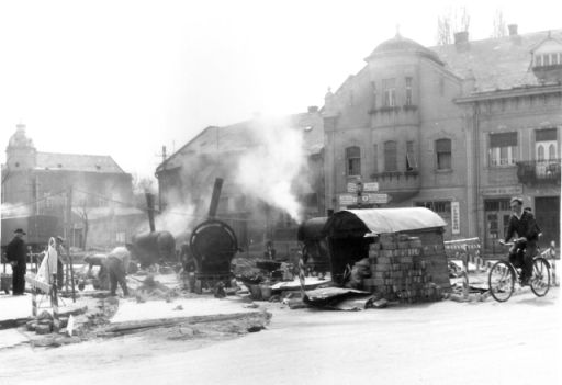 A díszes bérház előtt bő fél évszázaddal ezelőtti közlekedési eligazító táblákat is felfedezhetünk. Viszonylagosan nagy számukból pedig egyértelműen kiderül, hogy 1964-ben, az Eötvös tér a 4-es főút egyik fontos városi csomópontja volt. Aminek a képen látható alapos feltúrása azért okozhatott némi felfordulást a közlekedésben.