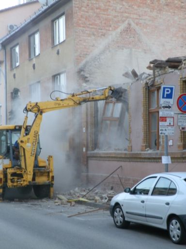 Két héttel ezelőtt megdöbbenve néztem, miként kezdenek hozzá az Arany János utca 24. szám alatti régi lakóház bontásához. A markoló az utcáról kezdte a kanalával szétszedni az épületet. A szomszédos telek előtt parkoló autó pedig csak akkor lett zavarótényező, amikor a ráhulló gerendát gyorsan le kellett szedni a motorháztetejéről. Miként az utcába bekanyarodó járművekkel se nagyon törődött senki, hiszen a lehulló törmelékek véletlenül egyiket sem találták telibe. Este hétkor zúgott a gép, szállt a por. Hogy a napközben dolgozó és este esetleg pihenni akaró, környéken élőket ez zavarta vagy sem, nem tudom. A vállalkozót láthatóan ez sem nagyon érdekelte, hatósági ember meg munkaidő után már nem tűnt fel a környéken.