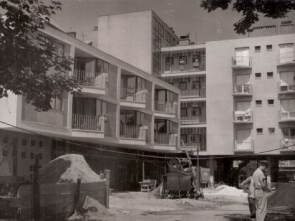 A Pap Bélától kapott fotógyűjtemény újabb darabja azt bizonyítja, hogy az Árkádos-ház lakásait jóval előbb elfoglalhatták a lakók, mint a későbbi Árkád presszó fölöttieket. Ráadásul a majdani legendás vendéglátó-ipari egység is csak később – szerintem 1964 késő őszén – nyithatta meg a kapuit. Mert, mint ezen az útépítési munkafolyamatok megörökítése miatt készített fotón is látszik, a 77 lakásos társasház jó néhány erkélyén már ágyneműket szellőztetnek az új lakók, a belső árnyékolók különböző mértékig vannak lehúzva, sőt, a negyedikről egy rövidnadrágos férfi is figyeli a Magyar utca elején dolgozókat. A rá merőleges, kétemeletes ház lakásai viszont üresnek tűnnek, avagy a nyári napfény tükröződik érdekesen az ablakokon. Az Árkád presszó jellegzetes, világító felirata viszont még nincs a helyén, miként az ablakok sem.