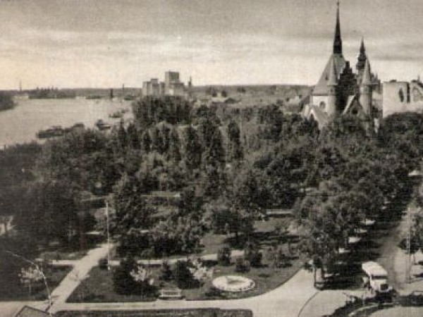 Amin persze első ránézésre semmi különös nincs. Ha jól sejtem, a Tisza szálló tornyából készült a felvétel, ami a fotózás pillanatában a Horthy Szabolcs tér és az Apponyi Albert utca sarkát mutatja. Mivel a háttérben már látható a tárház, a fotózás időpontjáról annyit mondhatunk biztosan, hogy 1935 után kellett történnie. És mivel a Trianonra emlékeztető virágágyás is ott van még, illetve a növényzet alapján nyári a felvétel, azt is kijelenthetjük, hogy legkésőbb 1944 közepén dolgozhatott a fotós.