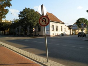 A Baross utca páratlan oldalán áll ez a tábla, ami elvileg azt tiltaná, hogy a belváros felől érkezők befordulhassanak az Ostor utcába, illetve visszaforduljanak itt. A feltételes mód azért indokolt, mert a tábla jelenleg a kínai bolt felé van fordítva. Azaz oda tilos visszafordulni. Egyszer már morogtam az elforgatott táblák miatt. Most morgok újra, mert ez egy veszélyes szórakozás. És nem lenne tilos észrevenni.