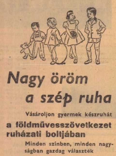 Bár azt hiszem, akkoriban inkább az „imázs hirdetések” voltak divatban, amelyek például azt tudatosították, hogy szép ruhát és készruhát – akár gyerekeknek is – a földművesszövetkezetek boltjaiban lehet kapni. Ne feledjük, a hatvanas évek elején, amikor Szolnokon 80 ezer forintból újította fel a helyi földművesszövetkezet a Kossuth utcai Halászcsárdát, a tanács pedig a Kertvárosban 30 ezer forintból éppen építette a művelődési házat, nemcsak a falvak, de bizony a megyeszékhely ellátásában is fontos szerepet játszottak az ilyen boltok. Amelyekben, miként a mellékelt karikatúra is utal rá, bizony „divatozni” is lehetett, azaz megjelentek a hagyományos viselettől eltérő, már-már tömegcikknek is nevezhető, modern ruhák.