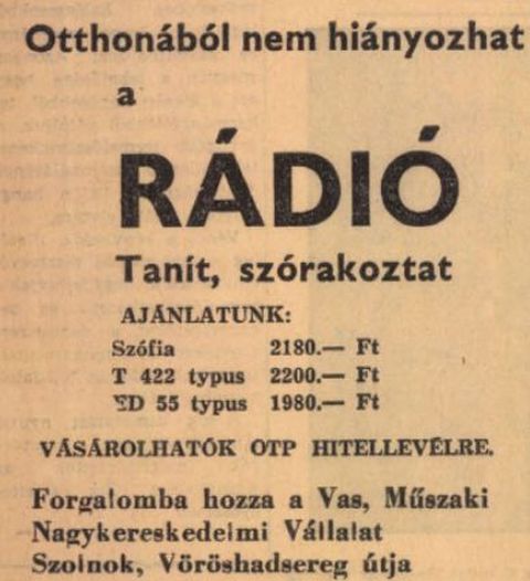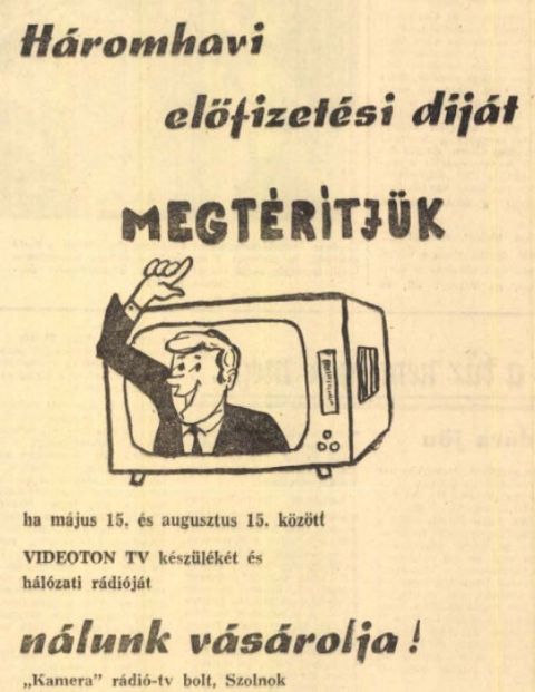 Tíz évvel később, 1972 májusában szerintem már nem elsősorban rádiókészülékre vágytak a szolnokiak (sem), hanem sajt televízióra, bár tegyük hozzá, addigra minden második háztartásban volt tévé. Miként talán verseny is az üzletek között, hogy magukhoz csalogassák a tévére vágyókat, például az előfizetési díj visszatérítésével. Merthogy akkoriban egyfajta adót kellett fizetni a készülékek után. Igaz, a Kádár-kor közepén sokan már nemcsak tévére vágyhattak, hanem nyaralóra is, amiben a Tüzépek is igyekeztek segíteni az előre gyártott és a telken könnyen összeállítható faházak forgalmazásával. Szerintem még ma is sok szolnoki telken áll ilyen fél évszázados faház, miként ma is megvan az 1972-ben 5,5 millió forintért épült Mátyás király úti 120 személyes óvoda vagy éppen a Szolnok megyei Temetkezési Vállalat akkor épült székháza – a mai Áchim és Liliom út sarkán -, na meg az akkor új Kolozsvári felüljáró, amit 50 millióból építettek abban az évben.