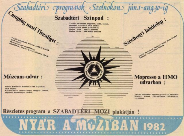 És akkor ugorjunk újabb tíz évet a régi májusok felidézésében, és lepődjünk meg azon, hogy 1982 májusában iskolaépítésektől volt hangos Szolnok. Zajlott a Verseghy gimnázium felújítása, a 605-ös számú szakmunkásképző bővítése, elindult a szandaszőlősi iskola korszerűsítése, miközben átadásához közeledett a Kodály és a Széchenyi lakótelep második általános iskolája. Ezekhez képest talán mellékes volt, hogy három év alatt sem sikerült elkészülni a Zagyván átívelő gyaloghíddal, viszont átadták a Vörös Csillag Ruhaipari Szövetkezet Mester utcai új gyárát, és jól haladtak a Széchenyin a víztorony építésével is. Sőt, a templomkertben lévő szabadtéri színpadi is megszépült 1982 májusában, továbbá 1 millióból a múzeumudvart is sikerült felújítani. Ez utóbbiak a Szolnok megyei Moziüzemi Vállalt nyári tervei miatt is fontosak voltak, hiszen öt helyszínen terveztek szabadtéri vetítéseket. Ráadásul a helyszínekhez igazodó tematikával, összességében a hét minden napján. Micsoda idők?