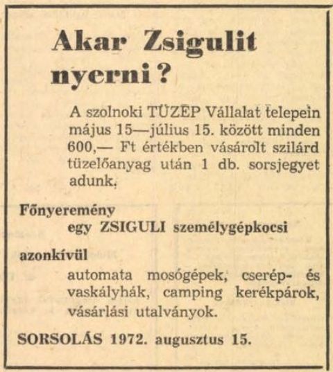 A vágyak netovábbja azonban egy saját autó lehetett 1972-ben, aminek akkor már nemcsak a pénz, hanem a kínálat is határt szabott. Míg a hatvanas években viszonylag gyorsan hozzá lehetett jutni egy-egy új autóhoz, sőt a Merkúr nevű állami autókereskedő cég kínálatában nem szocialista modellek is feltűntek, a hetvenes évek elejére ez megváltozott. Nem véletlen, hogy a korabeli lapok egyik fontos rovata volt a hetente közölt gépkocsisorszámok állása, amelyek alapján nagyjából be lehetett lőni, mikor ékezhet meg az „új családtag”. Őszintén megmondom, kicsit meg is lepődtem, hogy ebben a gépkocsi hiányos időkben a helyi Tüzép vállalat egy Zsiguli kisorsolásával próbált vevőket csalogatni. Eddig azt hittem, autót nyerni csak az OTP nyereménybetétkönyveivel, később pedig a Márka üdítők kupakjával lehetett.