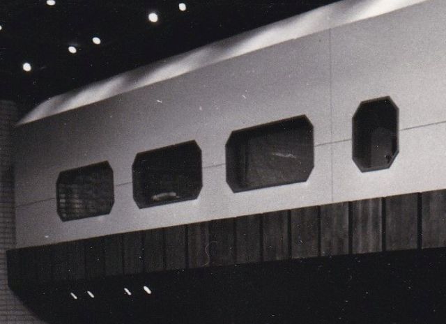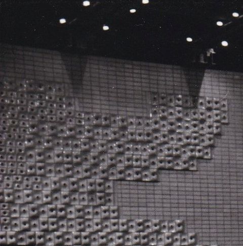 Ott pedig, ahol jelenleg, a színpadi rálátás szempontjából egy elég szerencsétlen karzata van a teremnek, egykor technikai helyiségek sorakoztak. Azaz a felvétel tetején végigfutó fehér falban lévő, fura alakú ablakok mögött voltak a világosítóknak, a hangosítóknak, de még a vetítőknek is a helyük. A terem két rövidebb oldalán – azaz a mai színpad és a nézőtér mögött – pedig talán két teljesen egyforma (ebben nem vagyok biztos) kerámia faliképet láthattunk. A három különböző méretű, domború és homorú felületű, középen lyukas elemekből kirakott alkotások engem stilizált madarakra emlékeztettek, és hosszasan tudtam nézegetni őket egy-egy unalmasabb előadás alkalmával.