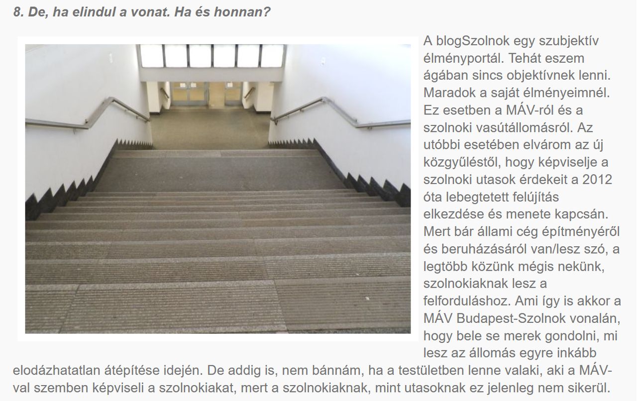 A blogSzolnok egy szubjektív élményportál. Tehát eszem ágában sincs objektívnek lenni. Maradok a saját élményeimnél. Ez esetben a MÁV-ról és a szolnoki vasútállomásról. Az utóbbi esetében elvárom az új közgyűléstől, hogy képviselje a szolnoki utasok érdekeit a 2012 óta lebegtetett felújítás elkezdése és menete kapcsán. Mert bár állami cég építményéről és beruházásáról van/lesz szó, a legtöbb közünk mégis nekünk, szolnokiaknak lesz a felforduláshoz. Ami így is akkora a MÁV Budapest-Szolnok vonalán, hogy bele se merek gondolni, mi lesz az állomás egyre inkább elodázhatatlan átépítése idején. De addig is, nem bánnám, ha a testületben lenne valaki, aki a MÁV-val szemben képviseli a szolnokiakat, mert a szolnokiaknak, mint utasoknak ez jelenleg nem sikerül.”