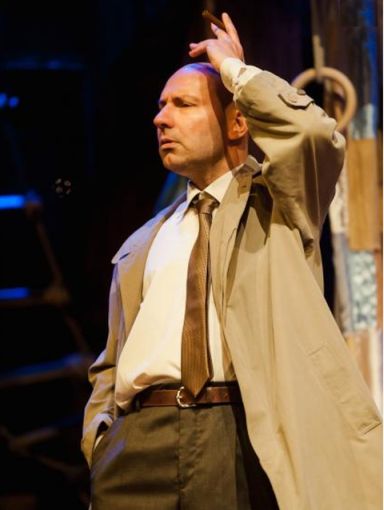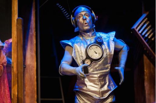 Mindehhez Jánoskúti Márta ismét gyönyörű, a karrakterekről mesélő jelmezeket alkotott. Robinson a gép ruhája első osztályúan illeszkedik a rendezői koncepcióhoz és Kinczel József (2. kép) szerepformálásához, ahogy a Detektív ruhája is csak ilyen lehetett ebben az előadásban. Ami pedig Témüller mackónadrágját illeti – amin az első színpadra lépésénél hosszan kellett nevetnem -, jól mutatja, hogy nem az anyagtól és a bekerülési költségtől lesz egy jelmez jó.