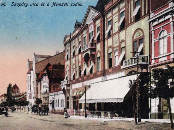 El nem tudom képzelni, hogy Varga József szolnoki könyv- és papírárukereskedő hány ezer koronát kérhetett ezért a Szapáry utcát ábrázoló festett képeslapért, ha annak postázása 1925. május 2-án ezer koronába került. A későbbi arányok alapján 2-3 ezerre tippelném az eredetileg – szerintem – valamikor az első világháborúban vagy előtte készült, a Nemzeti szálló reklámozását is szolgáló lap árát öt évvel Trianon után. És nagyjából másfél évvel a pengő bevezetése előtt, amiről akkor persze még nem lehetett sejteni, hogy az elő világháború és a trianoni döntés után elinflálódó koronát meghaladó hiperinflációt követően fejezi be pályafutását. A magam részéről bízom benne, hogy az ezt a képeslapot Szolnokról Kispestre küldő, és a lap hátuljára írt szövege alapján nagyon elfoglalt Feri, illetve a címzett Hegedűs Ilonka „nagyságos úrleány” is megélte nemcsak a pengő be-, de kivezetését is, hiszen akkor volt szerencséjük a 20. század mind a két világégését túlélni.