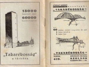 A feltételezhetően 1938 végén megjelent 16 oldalas, A6-os méretű, fűzött kis kiadványt az akkor már 12 éve működő, 13 ezer tagot számláló, ezáltal 60 ezer családot tagjai között tudó „Takarékosság” nevű vállalkozás jelentette meg. A kis füzetben található szlogenjük szerint „Mindent a fogyasztónak! Mindent a fogyasztóért!” elveket valló cég lényegében egy mai fogyasztói klub és hitelkártya előnyeit és szolgáltatásait egyesítő vállalkozás lehetett. Már, ha jól veszem ki a reklámfüzet első négy oldalán, 17 pontban gondosan összefoglalt szabályzatból. Eszerint a valamiféle tagsági füzetet ingyen váltó személyek Szolnok 66 üzletében készpénzfizetés nélkül vásárolhattak úgy, hogy az összegyűlt tartozásukat elegendő volt havonta rendezni. Ráadásul az adott hónap 10-e után eszközölt kiadásaikat nem a következő hónapban, hanem a rákövetkezőben kellett kiegyenlíteniük, ami a mai hitelkártyák 40-50 napos törlesztésére emlékeztet. Mindezek mellett a rendszerbe belépők a „Takarékosság” központjában kifizetett számlájuk ellenében valamiféle bónokat is kaphattak, amit ugyancsak 66 üzletben használhattak vásárlásra. És, ha mindez még nem lett volna elég, a rendszerhez csatlakozó üzletek 4-6 havi hitelt is nyújtottak vásárlóiknak.