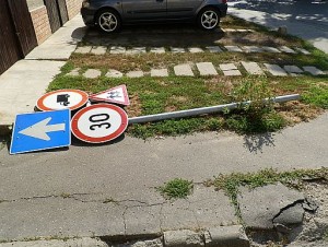 A fekvőrendőr után itt az új szolnoki találmány a fekvőtábla. Négykézláb közlekedőknek mutatja meg egyértelműen az irányt és a teendőket. Elsősorban is azoknak, akik olyan erősek egy-egy, a belvárosban átmulatott éjszakán, hogy egy táblával is könnyen elbírnak. Persze lehetne az is a cím, hogy: Ismét szellemi óriások jártak Szolnokon. Vagy: A kocsmák haszna. Vagy: Gyűlnek a romok a bulik után. Tessék választani!