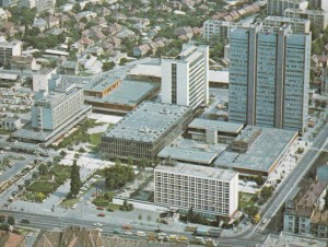 A két dokumentum alapján megállapíthatjuk, hogy az így rögzített tervből is viszonylag kevés valósult meg. A Vízügyi és az olajos székház, meg az előtte lévő parkoló, illetve a Centrum és a Pelikán elkészült. A maketten nem, de a felülnézeti képen látszik, hogy az itt már a Ságvári útig kitolt Centrum mögött, egészen a Pelikánon túli mai parkolóig egy mindent közrefogó passzázs épült volna, amiről oldalnézeti tervrajzokat is közöl az említett könyv. Látható, hogy a „Skálát” beljebb helyezték volna – elé parkolót gondoltak -, a mai Budapest Bank környékére pedig elkészült volna a vízügyi és olajos székházak párja. Hogy kinek, azt nem tudom, talán az egyikbe kapott volna helyet a városi rendőrkapitányság, amire utalnak néhány korabeli cikkben. Ám talán ennél is érdekesebb, hogy az eredeti tervek szerint a Batthyány és a Kápolna út közötti részt is el akarták dózerolni, mer a terület Baross utcához közelebb eső felén kapott volna helyet a megyei művelődési központ. Ami 1979-ben – tehát alig tíz évvel később – aztán nem ott nyílt meg.
