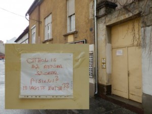 A Sütő utca egyik házának tulajdonos megunhatta, hogy a környék kocsmáinak vendégei a kapujában könnyítenek magukon. Nem tudom, a felirat segít-e. Ha igen, a belváros minden házfalát és kapualját ilyenekkel kell teleragasztani. Meg azzal, hogy akinek haszna van a péntek-szombati bulikból, az másnap reggelre takarítsa is ki a belvárost. A felirat készítőjével és az ilyen kívánságok közlőjével van a baj?