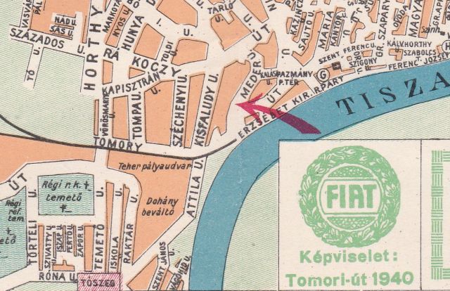 De vissza a helyi hirdetésekhez. A másik szolnoki reklám a FIAT képviseleté, amiről azonban csak annyi derül ki, hogy a „Tomori-út 1940” szám alatt található. Hogy ki üzemeltette, mi a telefonszámuk, mikor vannak nyitva, vagy mit kínálnak, arról egy szó sincs. Akinek baja van, vagy FIAT-ot akar, az menjen el a Tomori utcába (a hirdetésben i-vel a térképen y-nal a végén), ami a mai Mártírok és Indóház utca helyén volt anno. Az 1940-es szám viszont nem az utcán belüli házszámra utal, hanem arra az átmeneti állapotra, amikor Szolnokon is próbáltak áttérni az utcák szerinti házszámok használtára, a mindennapokban viszont még sokan a korábbi, a város házait és telkeit egytől sok ezerig emelkedő számok alapján tartották nyilván. Ha nem tévedek, akkor maga a FIAT képviselet egyébként a Meder utca végén, a Tárházzal szembeni, ma is ipartelepként funkcionáló helyen lehetett.