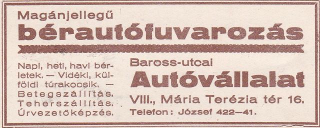 Viszonylag jó helyre került a „Baross-utcai Autóvállalat” hirdetése is – a hátlap tetejére -, akik napi, heti, havi bérletre kínáltak gépkocsikat, de beteg- és teherszállításra, sőt úrvezetőképzésre is vállalkoztak.