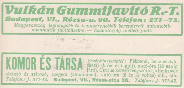 Vulkán Gumijavító Rt. a főváros hatodik kerületéből, akik, mint „Magyarország legnagyobb és legmodernebbül berendezett automobil-pneumatik (egy eltűnt szakkifejezés – a szerk.) javítóintézete” hirdetik magukat.