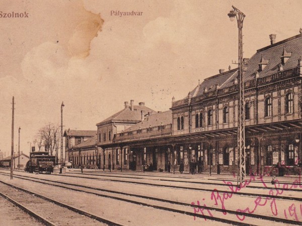 Az özvegy Lőrinczy Gyuláné, az Állomástőzsde kiadásában megjelent, az akkor alig néhány éves szolnoki vasútállomás épületét ábrázoló, 1914 júliusában postára adott képeslapot elsősorban a fotó bal oldala miatt vettem meg. Merthogy a Pfaff Ferenc által tervezett, 1907 és 1909 között épült, a mai helyén második szolnoki vasútállomásról ritkán bukkan fel olyan kép, ami nemcsak a főépületet, de a mai postaszárny vagy Szajol felőli részt is mutatja. Ennek köszönhetően ugyanis láthatjuk az épület északi lezárást, illetve a fő tömbhöz nem kapcsolódó, távolabbi – talán raktározás céljára szolgáló – épületeket is, amelyek előtt az indulásra váró mozdonyokat is felkészítették.