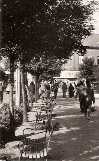 Akkor, amikor e képeslap tanúsága szerin még jóval kisebb közúti forgalom volt Szolnokon – vagy a tér tervezőinek a fejében. Különben kinek jutott volna eszébe, hogy a tér forgalom elől elzárt területének és az európai átmenő forgalmat is bonyolító 4-es útnak a határára, a közút felé fordítva tegyen le padokat. Azaz a megpihenni vágyók, igaz árnyékban, de mégis a teherautók és buszok kipufogójával ülhettek egyvonalban. És téved, aki azt gondolja, hogy ezek a padok korábban kerültek ide. Nem, ezek e fotó készítése előtt nem sokkal lettek a fák alá elhelyezve, ugyanis 1960 előtt nem láthatók a képeken. Azaz a tér átalakításának szülöttei. Igaz, nem éltek – álltak – sokáig.