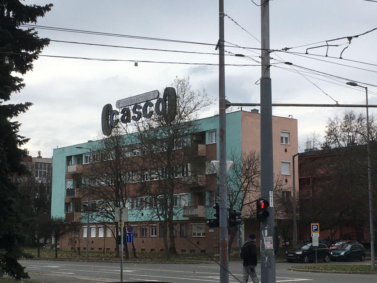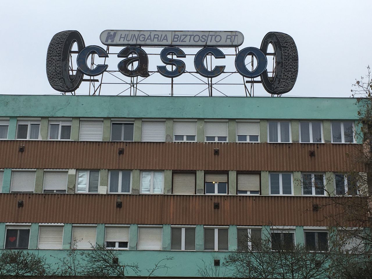 A Malomszög és Serház utca sarkán – a Dísz tér végén – ott áll az ifjúsági film elején is feltűnő lakóház, tetején lassan fél évszázada a szolnokihoz hasonló reklámeszközzel. Valamikor a nyolcvanas-kilencvenes években ezen is cégnevet váltottak, hiszen a Kádár-kor végén, a piaci szellem beeresztésekor a gépkocsibiztosítás az újonnan létrehozott, második biztosítóhoz, a Hungáriához került. (Úgy rémlik, mintha Szolnokon is felkerült volna a Kossuth téri fényreklámra ez a cégnév. Vagy tévedek?) Szóval a négyemeletes miskolci lakóház tetején még mindig ott van a Casco-felirat, két oldalán kerekekkel, amelyeken egykor úgy váltogatta egy automata a fényeket, hogy távolról úgy látszott, forognak a kerekek. Bár sötétben nem láttam, de lentről úgy tűnt, jó ideje nem világít már az a reklámeszköz, talán csak azért van a helyén, mert már senkié vagy senkinek se kell, és nincs, aki kifizesse a lebontását. Mit nem adnék érte, ha valami csoda folytán Szolnokra kerülne, és mint ipari emlék újra bevilágítaná a Kossuth és a Hubay utca között álló ház tetejéről a Kossuth teret.