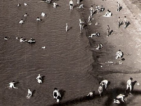 Ránézésre ugyanis bármelyik folyóparton, az emberek fürdőruháit nézegetve pedig 1945 és 1980 között szinte bármikor készülhetett volna ez a kép. Éppen a ruházat és a képen látható viszonylag sok stég és vízi jármű miatt gondolnám, hogy ez a fotó inkább az ötvenes évek végén készült.