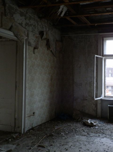 Az egykori Nemzeti Szállóban is felkerült a falakra a szinte a szocialista középületek dizájnjához kötelezően hozzátartozó fa lambéria. Itt is kapott párnázott ajtót a főnöki szoba, aminek plafonjára valami megmagyarázhatatlan, falapra preparált kockákból és gúlákból applikált képzőművészeti alkotást is szereltek. Álmennyezetek, foszlós tapéták, helyiségeket felosztó falak mindenfelé. Amiktől akkor is borzasztó lenne Fodor Dániel egykori szállodája belülről, ha nem állna évtizedek óta üresen, és nem pusztítaná az enyészet az utolsó használók nyomait is.