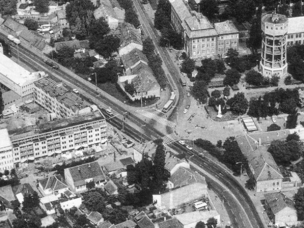 Amikor a víztorony lábánál lévő Eötvös téri park tulajdonképpen egy forgalom elől elzárt, zsákutcák által határolt terület volt. A képen természetesen még nyoma sincs a mai Gólya körforgalomnak, lámpás kereszteződés volt a József Attila, a Beloiannisz és a Tanácsköztársaság utcák találkozásánál. Az Eötvös téri házak előtt futó útról pedig egyáltalán nem lehetett itt kikanyarodni, hiszen egy könnyűszerkezetes „butiksor” állt ott, ahol ma már a Thököly út felől érkezik a forgalom. És igen, a mai nagy forgalmú út helyén az imént már emlegetett autósiskola rutinpályája volt, én magam is mindig itt találkoztam az oktatómmal. Viszont őszintén megmondom, hogy a víztorony körüli parkban nem nagyon jártam, egy rendezetlen dzsumbujként él az emlékeimben.
