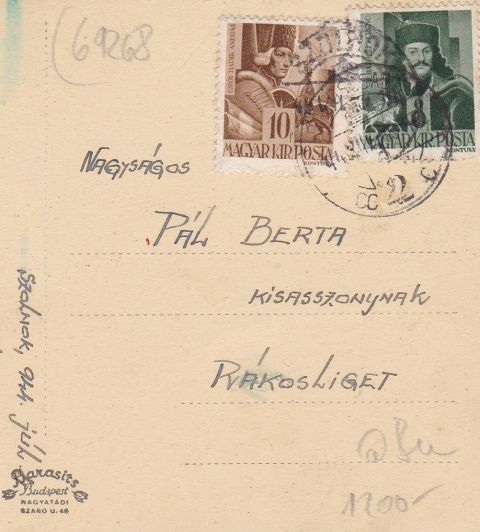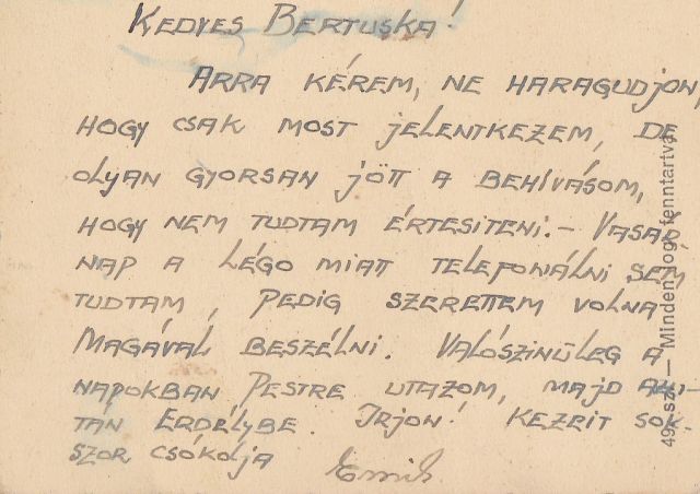 Szeretném hinni, hogy ezt a lapot tényleg az udvarló adta postára, akit a gyönyörűen megírt szöveg tanúsága szerint nagy hirtelen hívtak be katonának a második világháború ötödik évében. Üzenete szerint emiatt, meg az indulás előtti „légó”, azaz légitámadás miatt nem tudta értesíteni Bertuskát, pedig nagyon szeretett volna vele beszélni. Tegyük hozzá, a szöveg magázódva lett írva. Szóval a katona abban bízott, hogy néhány nap múlva visszajut Pestre. Feltételezem, hogy Szolnokról, hiszen innen küldte a lapot. Majd pedig – mint írja – Erdélybe indul, amiről akkor talán már ő is tudta, hogy ott a lassan, de biztosan közeledő Vörös Hadsereg ellen kell harcolnia.