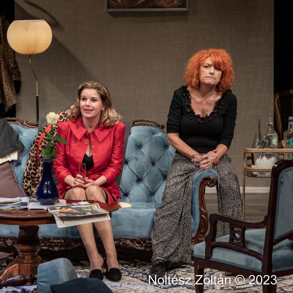 A szolnoki előadás két főszereplője egyértelműen Radó Denise és – végre, végre, végre – Sárvári Dia, aki tulajdonképpen a majdnem másfél órás előadásban végig a színpadon vannak. Az ő parádés évődésük, női játékuk ágyaz meg mind a három további szereplőnek, megfestve lényegében a karakterüket, az egyéni történeteiket. Nem tudom pontosan, hogy a két színésznő mennyi ideig „gyilkolja” egymást a színen – elrepült az idő -, de volt egy olyan pillanat, amikor hirtelen azon kezdtem gondolkodni: minek ide még három szereplő, és ők mit fognak csinálni. Ám ez nem sokáig tartott nálam, mert Szurdi Miklós nemcsak beszélteti, de elég komolyan mozgatja is a szereplőit a színpadon. Sőt, ha jobban belegondolok, előbb-utóbb mindenki a földre kerül, mindenki verekszik egy kicsit a másikkal, és lényegében mindenkinek része van abban a kuplerájban, ami a darab színhelyét, egy lakás nappaliját jellemzi.