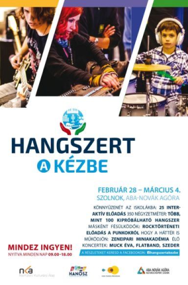 Február 28-án nyílik a Hangszert a kézbe rendezvénysorozat, ami a magyar zeneoktatás történetének egyik legnagyobb szabású eseménye lehet. A nyári szünetig nyolc városban, öt-öt napon át interaktív hangszerkiállítás, hangszersimogató, rendhagyó ének- és zeneórák, minikoncertek, szakmai rendezvények várják a fiatalokat és a zenélés iránt érdeklődő idősebbeket. Több mint száz kipróbálható hangszer, hangtechnikai eszköz és ministúdiók – ez a Hangszert a kézbe, amelynek első állomása a szolnoki Aba-Novák Agóra Kulturális Központ.