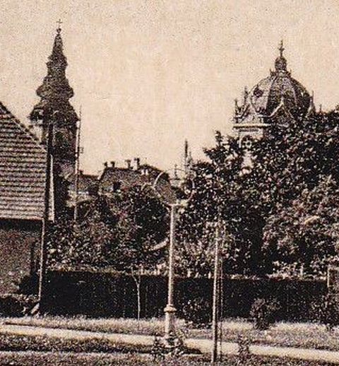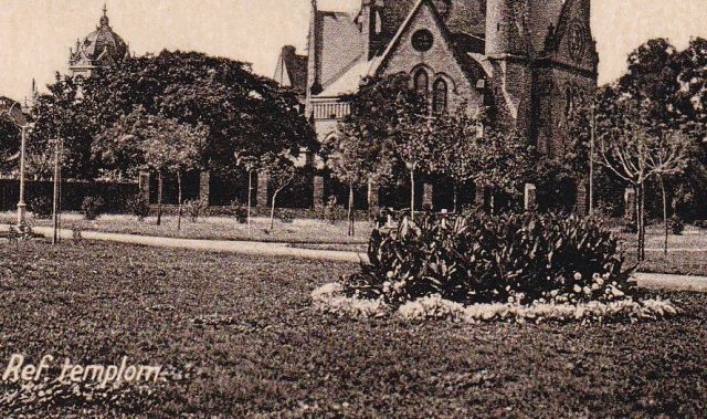 A zsinagóga kupolája miatt rávághatnánk, hogy a fotózásnak 1899 után kellett történnie. Igaz, ám ha jobban megnézzük a képet, akkor észre kell vennünk, hogy a református templom bal oldala mögül kilóg egy tető, ami szerintem a Tiszai hajósok terének sarkán álló Barta-palotához tarozik. Amit valamikor 1905-ben vagy 1906-ban építettek. Ám tovább bogarászva ezt a nyári vagy késő tavaszi, dús növényzetet is megörökítő képet, találunk még egy tetőt, ami bő évtizeddel szűkíti a fotózás intervallumát. A Nagytemplom és a zsinagóga között ugyanis ott a belvárosi iskola, tehát a felvétel csak 1914 után készülhetett. Mivel sem a bal szélen álló paplak, sem a Sóház és a Magyar utca találkozásánál lévő kisebb házak – közülük a jobb szélen lévő ugyancsak iskola volt – építésének dátumát nem ismerem, azok nem segítenek a szűkítésben. És a mögöttük látszó Papp szanatórium sem módosítja a fotózás lehetséges első időpontját.