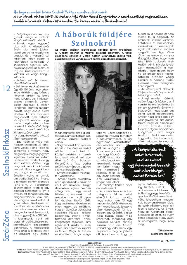 Az utóbbi időben, legtöbbször Líbiából láttuk tudósítani Al Ghaoui Hesnát, a Magyar Televízió riporterét. A fiatal újságírónő egykor a Varga Katalin Gimnázium diákja volt, és az Ifirkász Klub vendégeként nemrég ismét Szolnokon járt. (Részlet az interjúból)