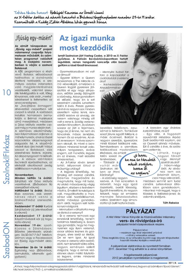 Ismét Szolnokon járt Vastag Csaba, a 2010-es X-Faktor győztese. A Pelikán Bevásárlóközpontban tartott legutóbbi, remek hangulatú koncertje után beszélgettünk a kissé fáradt énekessel. (Részlet az interjúból)