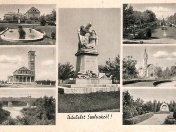 Sajnos nem tudom, hogy mikor jelent meg az első mozaik – azaz több fotóból összeállított – képeslap Szolnokról, az azonban bizonyos, hogy a második világháború idején már bevett szokás volt a fotók ilyen módon történő újrahasznosítása. Ha jobban megnézzük ezt a Niehold Jenő helybéli dohányárudás gondozásában megjelent Szolnoki üdvözletet, akkor azt mondhatjuk, hogy a fotók többsége már korábban is megjelent önálló képeslapként. A Kőrösi úti temető templomát ábrázoló képet és a Damjanich-szobor hosszú sövényes fotóját én még nem láttam képeslapon, a többit viszont akár klasszikusnak, azaz sűrűn felbukkanónak is merném nevezni.