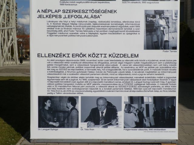A nevek és a képek alapján nincs kétségem afelől, hogy bár csak egy szombathelyi cég neve szerepel az installáción, az egész összeállításában és a végső verzió elfogadásában szolnokiak is közreműködtek. Akik vagy nagyon csekély ismerettel rendelkeznek a korszak szolnoki történéseiről, vagy eleve valamiféle tendencia irányította őket. Igaz, tudásukkal pazarul illeszkedtek a kiállítás országos eseményeinek összeállítóihoz, akik egy oldalon, négy képben, tulajdonképpen 2 évet akarnak elmesélni vagy felvillantani. Zárójelbe téve bármiféle időbeli következetességet. Már, ha fontos, hogy a történelemben egymás után következő események valami módon egymásra épülnek és hatnak. Igaz, mi ez ahhoz képest, hogy a szabad választások és az Antall-kormány megalakulását idéző sorokhoz az 1989-es kerekasztal tárgyalások fotója került Fejti elvtárs kopasz fejével?