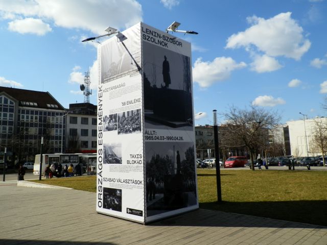 A legalább öt méter magas, minimum oldalanként két méter széles, tehát összesen vagy negyven négyzetméteres installáció láttán az első kérdés, amit fel kell tennünk, hogy vajon miért éppen most került ez ki Szolnok egyik forgalmas terére. Tény, hogy a rendszerváltást nem lehet egyetlen évszámhoz kötni. Néhányan már a világútlevél 1988. január 1-jei bevezetésétől kezdve számolják, míg mások csak 1989-et vagy éppen az első szabad választások évét, 1990-et tekintik annak. Természetesen 1991-re is lehet magyarázatot és akkor 30 éves évfordulót találni, hiszen abban az évben hagyták el az utolsó szovjet alakulatok Magyarországot, sőt Szolnokot is. Ám, ha nem egy megkésett – tavalyról vagy azelőttről kimaradt – kiállításról van szó, és az utóbbi dátum az apropó, akkor legalább egy fénykép és egy bekezdés kerülhetett volna a Vörös hadsereg kivonulásáról erre az utcai produktumra.