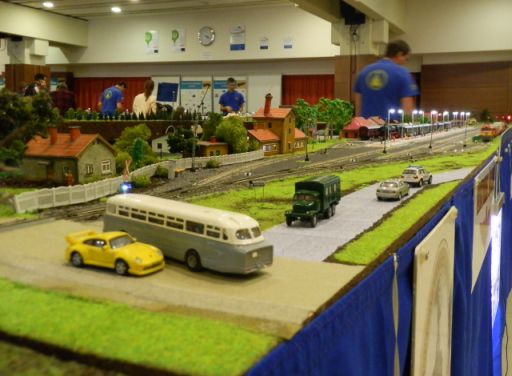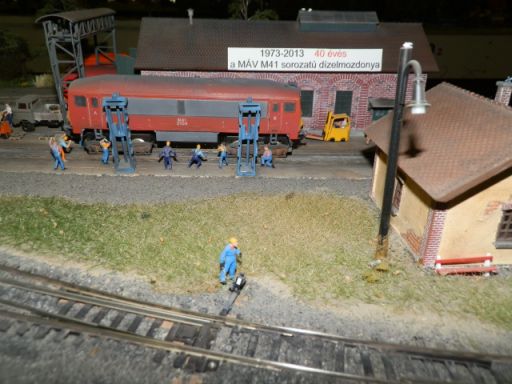 Az immár harmadik vasútmodell kiállítás gerincét – pontosabban legnagyobb terepasztalát – ezúttal is a veresegyházi Baranyai János Vasútbarát és Modellező Klub tagjai hozták, akiknek a közös alkotása az ANKK aulájának több mint a felét elfoglalja. Amiben talán nem is az a legjobb, hogy HO-s kisvonatok szaladgálnak az asztalon, és a többnyire meglett korú modellezők olyan vezényszavakkal engedik és fogadják a szerelvényeket, mintha valami rendező-pályaudvaron lennénk, hanem az a sok apró részlet, amit mellesleg megépítettek. Nem mondom, hogy mindent észrevettem, és a poénokat se szeretném lelőni, de azért a veresegyházi medveotthon, az egyik kanyarban zajló második világháborús ütközet, netán a guminehezékekkel letakart trágyadomb azért sokat elárul a modellezők hozzáállásáról. Amiben – úgy tűnik – fontos momentum a honi mozdonypark végtelen tisztelete, illetve a rendszerváltás előtti autók iránti nosztalgia. Minden veterános a könnyeivel küszködne, ha még valahol ennyi IFA, Barkas vagy Trabant tűnne fel egyszerre.