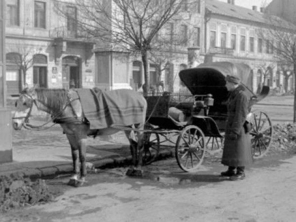 Az mindenesetre érdekes kérdés, hogy hol lehet a bérfuvarozást végző kocsis. Aki gondosan letakarta egy lópokróccal a lovát – mint aki új fuvarra mostanában nem számít -, a gyeplőt pedig lazán a bakra vetette. Amiből arra következtethetünk, hogy a korabeli „taxik” lovai végtelen nyugalommal, akár a kocsis nélkül is hosszan várakoztak a következő menetre. Érdemes egy pillantást vetni a bakon lévő feldőlt vödörre, ami a ló itatásának nélkülözhetetlen kelléke volt, és itt azt jelzi, hogy nem vízért ment a kocsis. Valahol egy seprűnek és zsáknak is kellett lenni a konflison, hiszen ha menetközben nem is, de a várakozás idején keletkező lócitromot nem hagyhatták maguk mögött a fuvarosok.