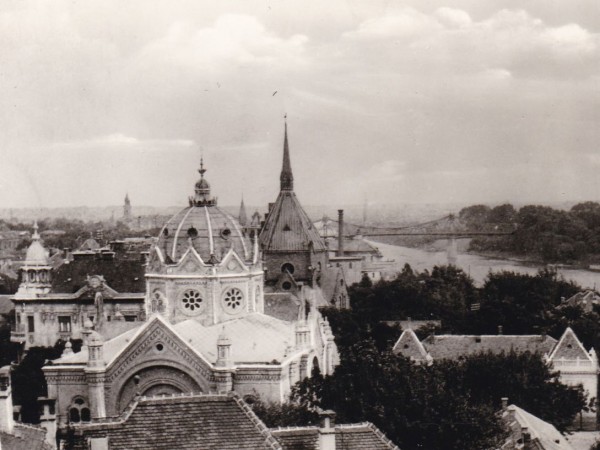 A belvárosi templom tornyából Kelet felé tekintve nagyon szépen látszik a város négy másik temploma, de feltűnik a zsinagóga mellett a Tiszai hajósok terének sarkán álló Barta-palota vagy éppen a környék legrégebbi épülete, a mai Galéria étterem is. A református templom mögött, a folyóparton felfedezhető a Tisza szálló fürdője és annak kéménye, de a bal oldali hídfőnél az egykori strand is felfedezhető. Szóval ezt a képet egészen biztos, hogy akkor készítették, amikor még Horthy Miklós volt az ország első embere.