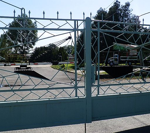 A két szárny közepébe ugyanis ügyes kezű lakatosok képeket hegesztettek. Az egyik szárnyba egy lánctalpas markolót – a márkáját meg nem tudnám mondani -, a másikba pedig egy platós ZIL teherautó kontúrját. Gondolom, mindkét jármű olyan, amit a kapu készítése idején az itt dolgozók használhattak is.