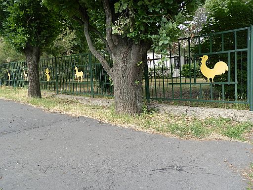 Esetleg éppen a Tallinn – leánykori nevén Vosztok – lakótelepi óvodát, amely ma már nem működik, viszont a kerítése azt a kort idézi. Itt is lehetett volna egyszerű függőleges szelvényeket egy keretbe, egymás mellé hegeszteni, aztán felrakni. De valamikor, valakinek eszébe juthatott, hogy ha már óvodához kerül ez a kerítés, legyen már benne valami, amitől a gyerekek szerethetik. És az egyszerű kerítéselemekbe fémből kivágott állatokat illesztettek. Amit aztán a brigádok rendszeresen le is festhettek, hiszen szinte minden figura még majdnem ép és a helyén van.