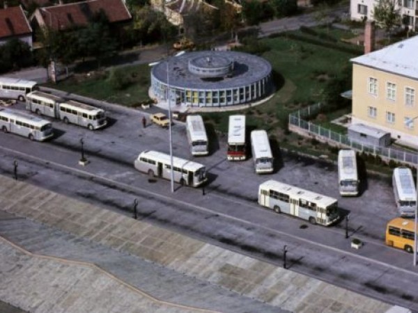 Minden Ikarusz rajongó zokogna örömében, ha még egyszer így láthatna élőben ennyi magyar gyártmányú buszt, ahogy ezen az 1974-es, UVATERV fotón látható. Én pedig akkor könnyeznék, ha a forgalmi iroda futurisztikus, körépületét bejárhatnám, ami a mából nézve igazi különlegesség volt.