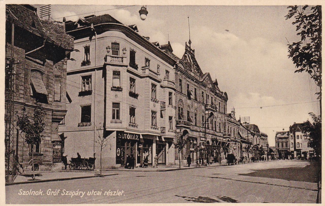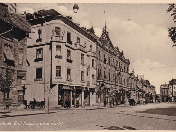 Kis túlzással azt mondhatjuk, hogy a szolnoki Szapáry út egykori páratlan oldala nem sokat változott az elmúlt nyolcvan évben. Persze csak akkor jelenthetünk ki ilyesmit, ha eltekintünk az olyan „apróságoktól”, mint az utcanévváltozások, a számozás megfordítása, és a képen látható házak kényszerű tulajdonos- és funkcióváltásai. Csak feltételezem, hogy a budapesti Knöpfmacher fényképész kiadásában megjelent képeslap a frissen elkészült Czinóber bérház miatt látott napvilágot, ami világos színével szinte kiviláglik a pár évtizeddel idősebb házak közül. Az épület külseje még hibátlan, és a szolnoki korzóra néző üzlethelyiségekből se mindegyiket foglalták még el a fotózás pillanatában. Talán éppen ifj. Czinóber László úr, a ház építtetője rendelhette meg a képeslapot, hogy ezzel is reklámozza kitűnő befektetését.